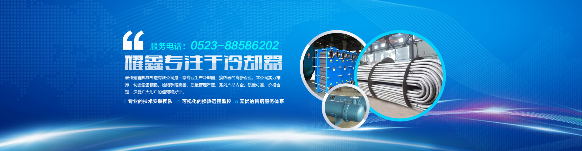 免費咨詢方案 +泰州耀鑫機械制造有限公司座落于風(fēng)景如畫的江蘇魚米之鄉(xiāng)--全國文明城鎮(zhèn)婁莊鎮(zhèn),是一家專業(yè)生產(chǎn)風(fēng)冷卻器、列管式冷卻器、板式冷卻器的企業(yè)。本公司實力雄厚、制造設(shè)備精良、檢測手段完善、質(zhì)量管理嚴密、系列產(chǎn)品齊全、質(zhì)量可靠、價格合理,深受廣大用戶的信賴和好評。